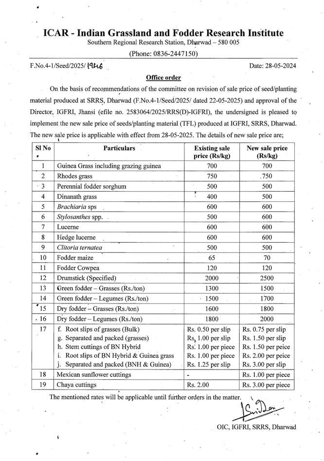 IGFRI Southern Regional Research Station, Dharwad was established in 1987 to cater the needs of Peninsular India comprising Andhra Pradesh, Karnataka, Kerala, Tamil Nadu, Pondicherry, Goa and Maharashtra. It has a office cum research farm spread over 10 acres at Saidapur farm in front of UAS, Dharwad and research, seed production and plant material multiplication farm at Tegur spread over 80 acres. The centre falls in the Transitional Zone (zone 8) of Karnataka receives an annual average rainfall of 1200-1300 mm. The year-wise distribution of rainfall for the last six years shows a bi-modal peak. The centre comprises a multidisciplinary team of highly experienced scientists working toward a targeted mandate of developing region-specific fodder technologies. It is actively engaged in the development of improved crop varieties, along with suitable production and protection technologies for perennial fodder crops adapted to the climatic and edaphic conditions of Southern India. Seed technology research and quality seed production also form an important component of the centre’s research activities. In addition, grassland development and grassland ecosystem research are major focus areas. The centre plays a key role in technology dissemination through capacity-building programmes and collaborations with KVKs, line departments, the Forest Department, Animal Husbandry Department, Watershed department, NGOs, and other stakeholders. It also undertakes the production and supply of quality seed and planting material to various clients, including farmers and other user groups. The centre further undertakes consultancy-based research projects in its mandated areas.