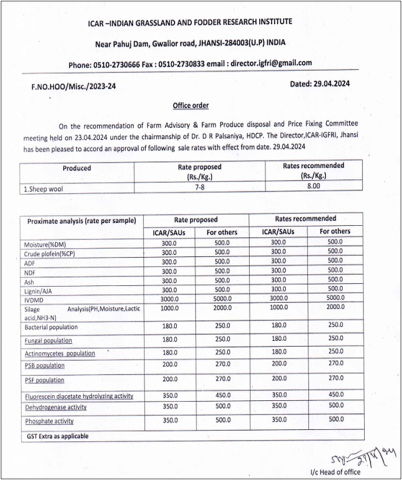 The Central Analytical Laboratory (CAL) also caters to the needs of scientists. In this laboratory, Quality parameter analysis such as dry matter %, acid detergent fiber %(ADF%), neutral detergent fiber %(NDF%), crude protein % (CP%), Acid digestible lignin % (ADL%), Ash %, micronutrients and other silage parameters such as lactic acid %, pH, ammonical nitrogen % is analysed. The rate list for analysis is given below: